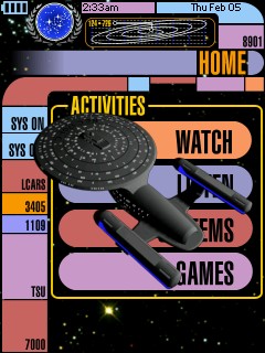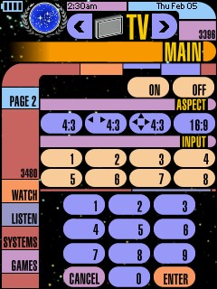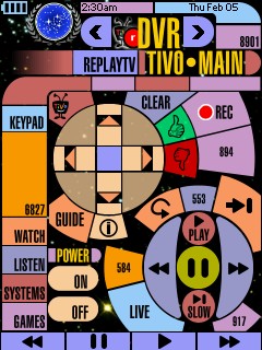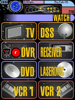 This PCF design is based on LCARS (Library Computer Access and Retrieval System), the graphical computer interface seen on certain Star Trek TV series. There are control pages for a TV, DSS receiver, TiVo, ReplayTV, Receiver, DVD player, LaserDisc player, 2 VCRs, CD player, tuner, tape deck, video games, lights, and curtains. A few of the standard system items have been replaced to take advantage of the whole LCD and create a complete design: - The activity icon is now a Star Trek phaser and pops up while the Pronto transmits.