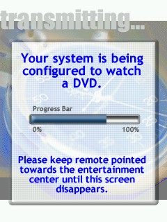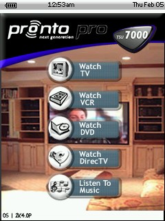 This design is straight forward and flexible and takes advantage of the advanced graphics capability of the TSU7000. The interface was designed to be user friendly for all who may use it. In most cases, each component has one screen containing the most used buttons that keeps �screen flipping� to a minimum. Furthermore, the user can switch from any component to another from any screen in the interface. For example, if you are watching TV and want to switch to the DVD, all you need to do is tap the DVD icon on the top of the page and the TSU7000 will turn off the TV and switch on all components needed to watch a DVD.What makes this design unique is the presence of the �splash� screens. Splash screens are the �animated� screens that appear while the TSU7000 is performing a lengthy macro. For example, when the TSU7000 is sending the commands to turn on a component, there are many steps it needs to perform. In the 5-7 seconds this takes to complete, this interface will flash through screens updating the user on the status of the task.