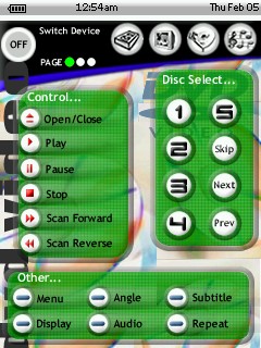 The third shot is of the DVD interface. The interface was designed to present the most used buttons on one page, which will keep �page flipping� to a minimum. Also, notice the Switch Device template at the top of the screen. This allows the user to switch to any of the controlled components while using the DVD player. This template appears at the top of all control pages within the interface. If need be, this interface can be expanded to more than one page. This is true for all of the control pages within the interface.