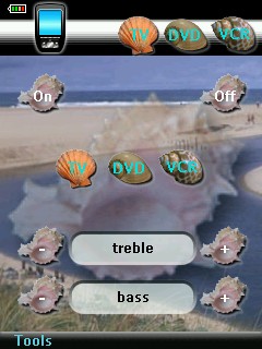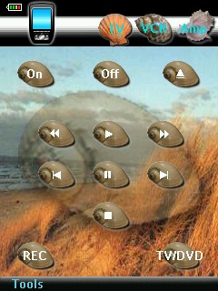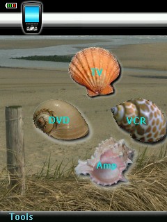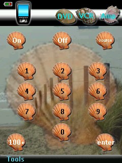 With this file I wanted to demonstrate the usage of animations. The theme that is chosen is based on the seashore. Four types of shells are used to represent the four devices TV, VCR, DVD and Amp. They are presented right away on the home page.- All devices have their own sea shore background. The buttons on each device are small versions of the shells to get a uniform look and feel. The top bar shows the other devices for quick selection.