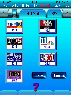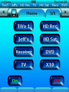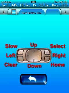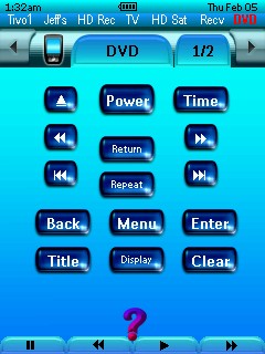 This is my first Pronto configuration. My goal was to replace my MX-1000 with the TSU7000, and add a few things that I could not do on the MX-1000. I set out to create a 100% original art work configuration. I created the buttons using Crystal Buttons, followed up with enhancements using PhotoImpact. I also tinted the system bitmaps blue by replacing the bitmaps in the PCF file, and created pressed bitmaps of all buttons to look like they are lighting up when they are pressed. I created a device bar for my major devices. This can be clicked to jump directly to a device although you have to use your fingernail since it so small. I also created an information screen for the device hard buttons.