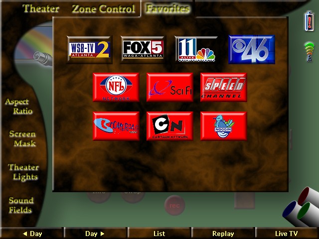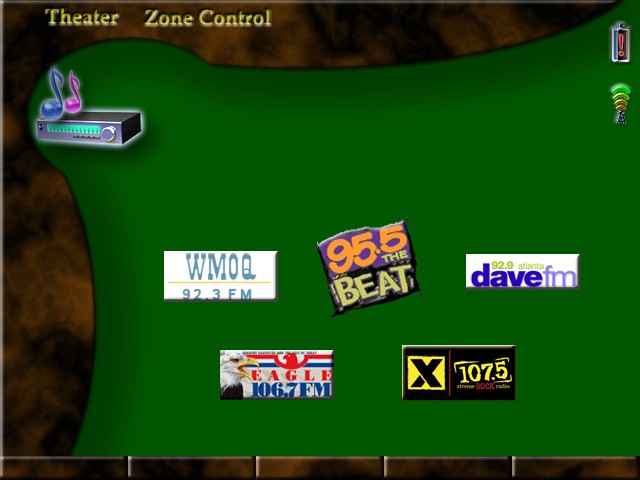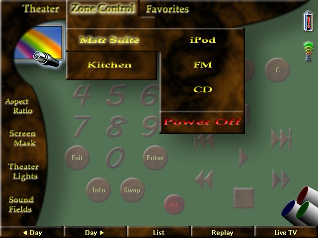 The basic concept for this configuration is to mimic drop-down menus. Any device can be accessed and controlled from any page on the remote. This method is very straight forward and universally understood by anyone who used a computer making it very easy for friends, family, or children to pick up and use with little instruction. As the rules suggested, I focused on graphics and navigation rather than making sure it had working codes and macros everywhere. All graphics were done with Photoshop and with a couple of master PSDs, adding or changing graphical elements is very easy. I attempted to place the most commonly used commands on hard buttons to avoid using the screen as much as possible. I had planned on using recorded voice-overs instead of text for “HELP” prompts, but decided to skip this for now as the simulator will not play them back. I also no longer think it’s necessary, as this configuration is “Drop-Down Simple”! |