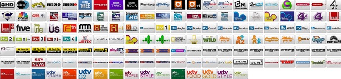 A collection of 148 UK Sky TV network logos provided in 3 sizes and styles, including pressed state and released state versions.