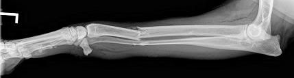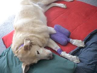 Her surgery included 5 pins through the bones with external rigging to stabilize the bones. then some serious Hot Dog bun wrapping to cover it all up. She is able to get up and go out for potty breaks every 5-6 hours