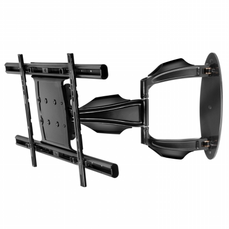Would a single stud articulating fit the bill?  Peerless SA752PUB Wall Mount 32 In.- 52 In. Cantilever Black Edit - don't know if that arm extends far enough, especially with attached L-R speakers, but I'm guessing soundbar or ceiling speakers; arm extends 27" Edit #2 - also depends on the locations of the studs, info you don't have right now There are no speakers, it's just a plain ole tv. But i'm always leery of a single arm articulating...havng said that, the client wants as much of the mount/bracket hidden behind tv, which is possible with the mount pictured above, not so much with a swing arm.... But thanks