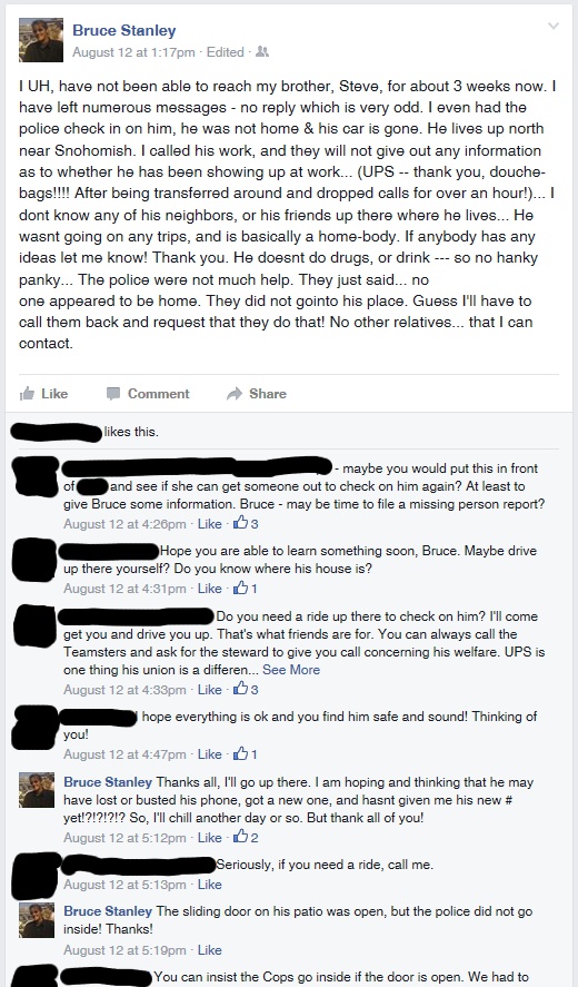 Reported my brother missing. Have not been able to contact him or receive any messages or texts in 2 weeks. Left several voice messages..."Please call etc." --- Finally had the police go check on him. He wasn't around, car gone, neighbors have not seen him. Very, very unusual. On August 13, 2015 at 20:29, Mr. Stanley said...