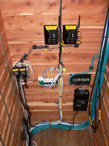 A+ for puttig a label on everything. You wont ever kick yourself for having more labels than you need :). I noticed some sharpie action on some of the cables. Use labels there instead. Also.. use white text on black labels for the front of the rack so they blend in better. Home run your cresnet cables for each device in the rack. Its perfectly fine to daisy chain but you have plenty of space on the C2NHBLOCK troubleshooting will be easier later if you run into a problem. I see a jagged hole in the top corner of the cedar closet. Looks like a bunch of 1 inch holes next to each other where the cable comes out. Use a bulk cable wallplate to clean it up. Why are you using universal remote control base stations? Should have used a crestron RF base station and made those remotes part of the crestron system. I know theres an upfront cost difference but if your boss adds up the labor involved in programming & integrating 2 control systems vs using one it all works out to be the same IMO. I cant tell if your using electrical tape on the cable boxes to hold the emitters or not. If your not interested in opening the cable boxes to hide the emitters inside use hotglue to hold them on. It looks better and hold better than the electrical tape will. Cat5's & cresnet on the back wall. Put that stuff in the rack so that your bundle of cables comes straight down the wall in a neat bundle and goes directly to the rack. Use a rack mount patch panel to handle every cat5 in the house & rack & mount the crestron power supply & C2NHBLOCK to a CNXRMAK. Mount both of these to the back of the rack facing out. This keeps the back wall clean & gives you one less point to worry about as far as things being pulled loose when the rack gets rolled out. [Link: crestron.com] About lacer bars.. Less is more. I put 1 bar per component and i line it up with the bottom of the shelf o i have room to get my hand in there later if i ever have to service it. I learned my lesson with using 2 many lacer bars once. It looked awesome but good luck getting to your connectors :). About custom length interconnects. I use liberty compression fittings with mini cable. Easy to manage and less overall bulk vs using RG59 or RG6. I would probably have put the request unit right under the BD players so everything with a drive was up high. I always have a 1U space above and below amplifiers so IMO its good that you have that space there. I know this is nitpicky stuff but thats because your work is pretty damn good. I would like to show you pics of the racks i wired @ 23. It would give you something to laugh about :).