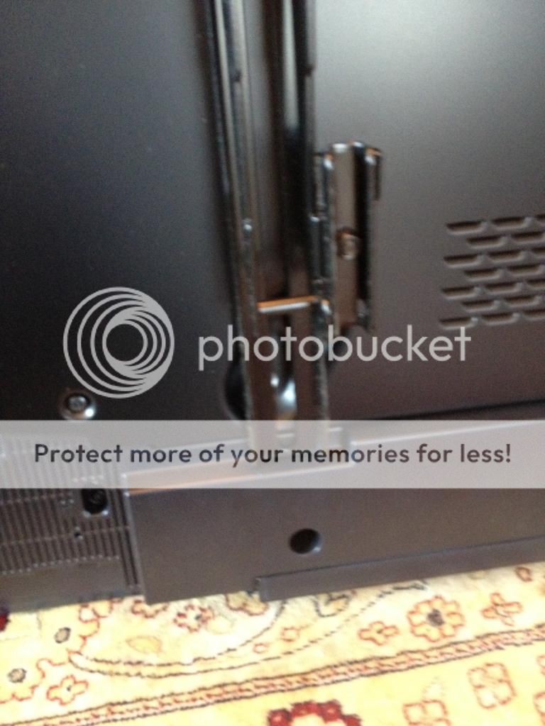 I swear they're slowly trying to kill us. But first they want to make us go insane. I installed a Samsung UN46ES6600 yesterday with a Strong tilt mount. The arms on this mount are pretty much the standard size that you get with most manufacturers. Samsung decided to have a bump out on the back that I am guessing is possibly for the speakers? Not sure. I know it creates an issue though:  The arm is as far down as it can go. It is resting on the bump out This is the top of the arm while the bottom is resting on that bump out. You can see the hole does not line up so the arm would have to be raised. Of course the arm would then be visible.