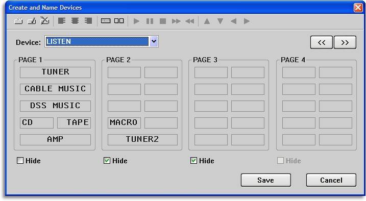 Creating new devices in MX-950 Editor. Notice how some devices can occupy two columns (for instance, "Tuner").