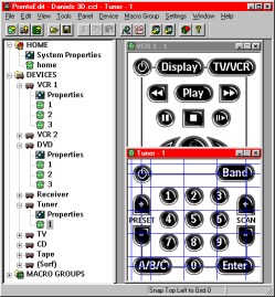 Upon exploring a few menu items the first obvious benefit of ProntoEdit is that you can open, save and merge any number of configurations - both your own and those downloaded from sites on the Internet. CCF file contents are displayed as a familiar Windows file navigation tree with three main sections: Home, Devices and Macros. The "Home" section configures the main welcome screen of the Pronto where the main list of configured components is stored. "Devices" is where all actual component panels are arranged, and "Macros" is where screens dedicated to system automation routines are located.