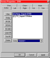 Under the expanded contents of the Home section is a System Properties screen where all default IR signals are defined for the Left, Right, Volume, Mute and Channel buttons - a handy feature if you always use the Amplifier to control the volume and don’t want to set those buttons up for every device. Each component under the Device section also has a similar Properties screen where hard-button signals are assigned for all panels therein. Assignments on this screen override any defaults you may have set up in the main Properties screen.