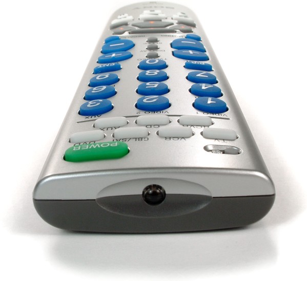 A direct front view of the Sony RM-V402 preprogrammed remote control. In this photo you can see the IR emitter.