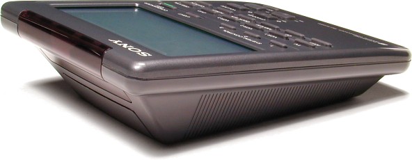 Side view of the Sony RM-AV2000. The base is tapered with ridging for finger grips. It will fit comfortably on a tabletop, a lap or in medium-to-large hands.